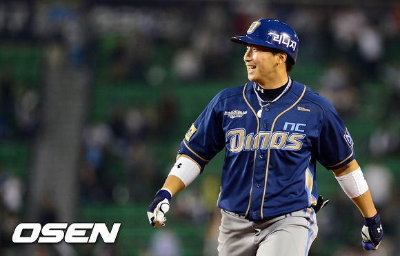 11일 오후 서울 잠실구장에서 열린 '2013 한국야쿠르트 세븐 프로야구' 두산 베어스와 NC다이노스의 경기 9회초 2사 만루 나성범이 2타점 적시타를 치고 기뻐하고 있다.