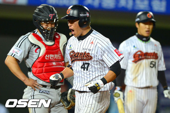 11일 오후 부산 사직구장에서 열린 '2013 한국야쿠르트 세븐 프로야구' 롯데 자이언츠와 LG 트윈스의 경기,8회말 1사 1,3루 롯데 신본기 타석, LG 임찬규의 송구 실책을 틈타 3루 주자 강민호가 홈을 밟으며 환호하고 있다