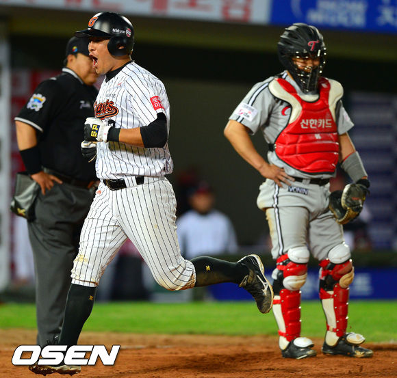 11일 오후 부산 사직구장에서 열린 '2013 한국야쿠르트 세븐 프로야구' 롯데 자이언츠와 LG 트윈스의 경기,8회말 1사 1,3루 롯데 신본기 타석, LG 임찬규의 송구 실책을 틈타 3루 주자 강민호가 홈을 밟으며 환호하고 있다