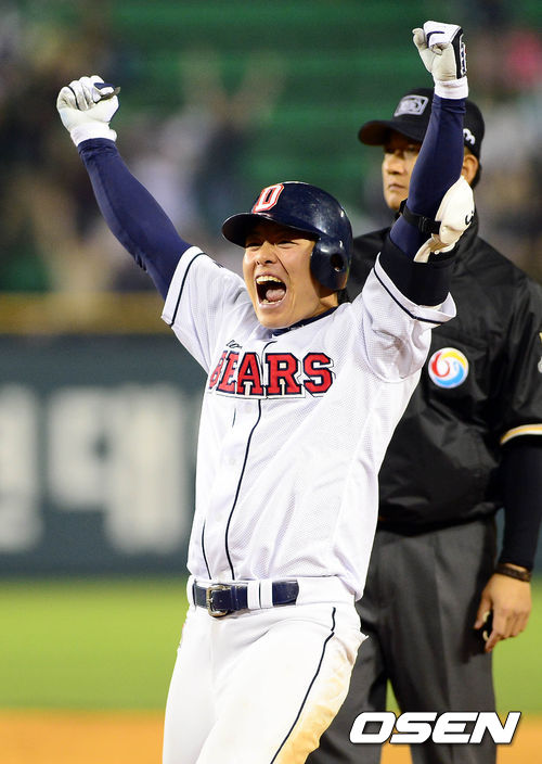 11일 오후 서울 잠실구장에서 열린 '2013 한국야쿠르트 세븐 프로야구' 두산 베어스와 NC다이노스의 경기 9회말 2사 2루 민병헌이 끝내기 안타를 치고 환호하고 있다.