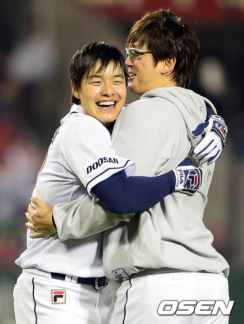 11일 오후 서울 잠실구장에서 열린 '2013 한국야쿠르트 세븐 프로야구' 두산 베어스와 NC다이노스의 경기 종료 후 민병헌이 김선우와 포옹을 하고 있다.