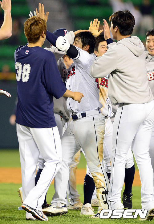 11일 오후 서울 잠실구장에서 열린 '2013 한국야쿠르트 세븐 프로야구' 두산 베어스와 NC다이노스의 경기 종료 후 민병헌이 동료들과 승리의 기쁨을 나누고 있다.