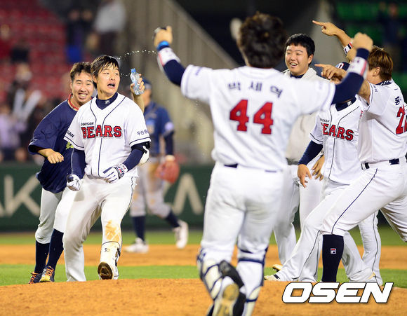 11일 오후 서울 잠실구장에서 열린 '2013 한국야쿠르트 세븐 프로야구' 두산 베어스와 NC다이노스의 경기 종료 후 민병헌이 동료들과 승리의 기쁨을 나누고 있다.