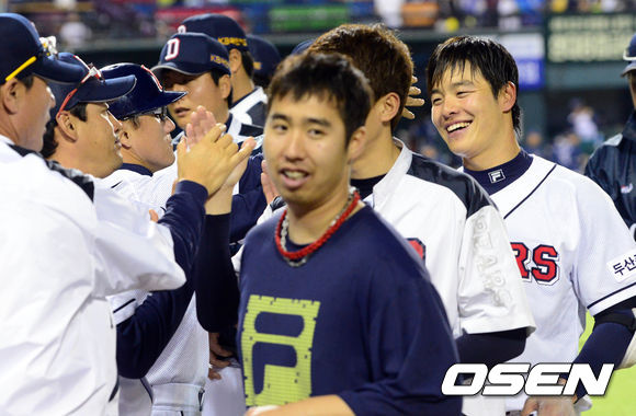 11일 오후 서울 잠실구장에서 열린 '2013 한국야쿠르트 세븐 프로야구' 두산 베어스와 NC다이노스의 경기 종료 후 민병헌(오른쪽)을 비롯한 선수들이 하이파이브를 하고 있다.