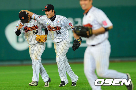 경기종료 후 롯데 정훈이 유격수 신본기를 격려하며 더그아웃으로 들어가고 있다 ./ soul1014@osen.co.kr