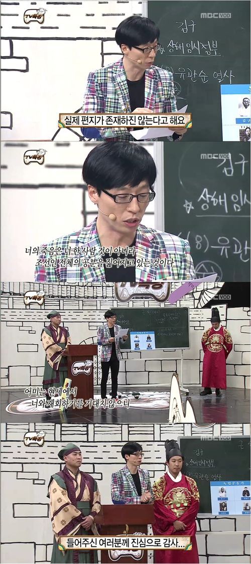 유재석의 목소리를 통해 전달된 “네가 만약 늙은 어미보다 먼저 죽은 것을 불효라고 생각한다면 네 어미는 웃음거리가 될 것이다...(중략) 네가 항소를 한다면 일제에 목숨을 구걸하는 짓이다...(중략)딴 마음 먹지 말고 죽으라. 옳은 일을 하고 받은 형이니 비겁하게 삶을 구걸하지 말라...(중략)”라는 내용의 편지는 안방극장의 눈물샘을 자극하는 동시에 시청자들의 잊고 있었던 역사의식을 고취시켰다.