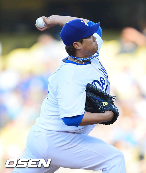 12일(이하 한국시간) 미국 캘리포니아 로스앤젤레스 다저스타디움에서 열리는 LA 다저스와 마이애미 말린스의 경기, LA 다저스 류현진이 힘차게 공을 뿌리고 있다.