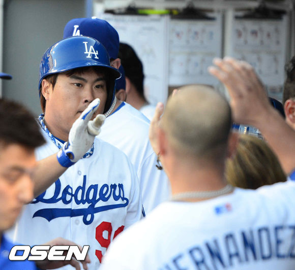 12일(이하 한국시간) 미국 캘리포니아 로스앤젤레스 다저스타디움에서 열리는 LA 다저스와 마이애미 말린스의 경기, 2회말 1사 주자 1,2루 LA 다저스 류현진이 희생번트에 성공시킨 후 덕아웃에서 동료들과 하이파이브를 하고 있다.
