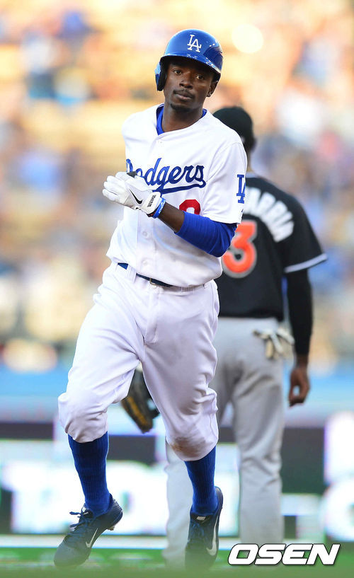 12일(이하 한국시간) 미국 캘리포니아 로스앤젤레스 다저스타디움에서 열리는 LA 다저스와 마이애미 말린스의 경기, 3회말 첫타석에서 LA 다저스의 고든이 우중월 솔로 홈런을 날린 후 그라운드를 돌고 있다.