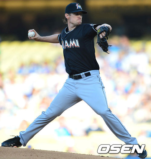 12일(이하 한국시간) 미국 캘리포니아 로스앤젤레스 다저스타디움에서 열리는 LA 다저스와 마이애미 말린스의 경기, 마이애미 케빈 슬로위가 힘차게 공을 뿌리고 있다.