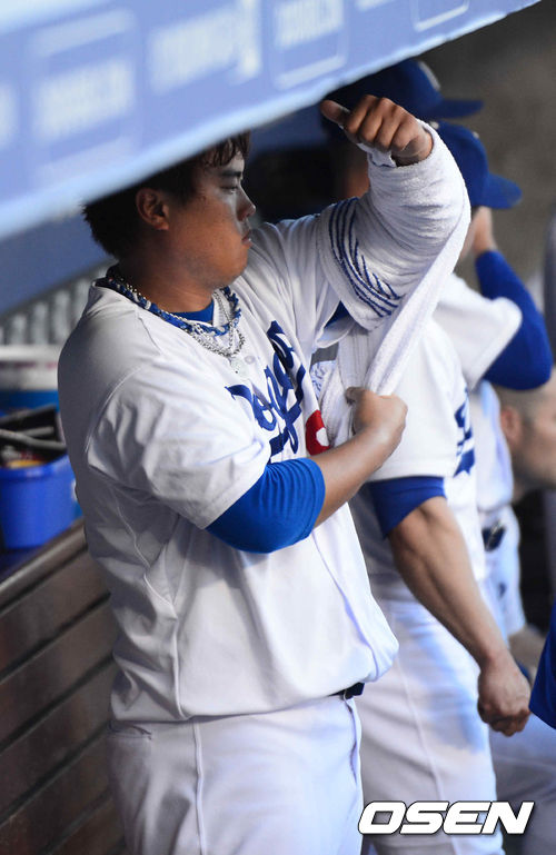 12일(이하 한국시간) 미국 캘리포니아 로스앤젤레스 다저스타디움에서 열리는 LA 다저스와 마이애미 말린스의 경기, 류현진이 덕아웃에서 팔을 수건으로 감고 있다.