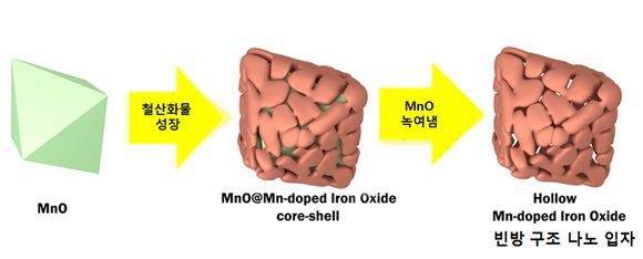 MnO 나노 입자를 형판(template)으로 철 산화물을 성장시킨 뒤, MnO 나노 입자를 녹여내, 빈방 구조의 나노입자를 제조한다.