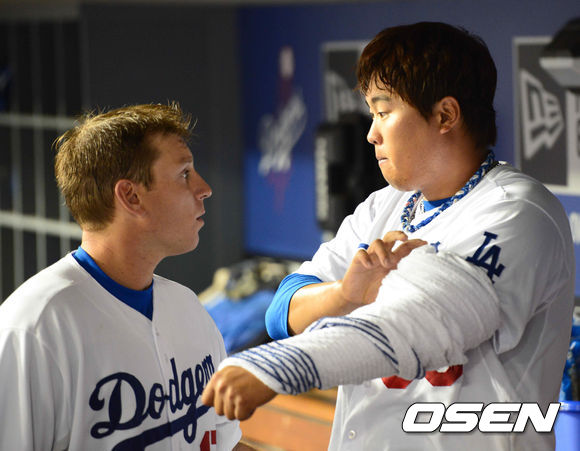 12일(이하 한국시간) 미국 캘리포니아 로스앤젤레스 다저스타디움에서 열리는 LA 다저스와 마이애미 말린스의 경기, 6회를 마친 후 A.J 엘리스 포수가 류현진과 얘기를 나누고 있다.