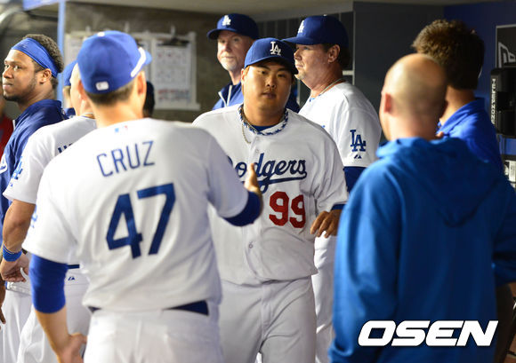 류현진이 7회초 말린스 공격 2사 1루 상황에서 마운드를 내려온 뒤 더그아웃 동료들과 인사를 나누고 있다./ dreamer@osen.co.kr