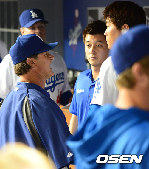 류현진이 6회말 투구를 마치고 더그아웃으로 들어와 돈 매팅리 감독과 대화를 나누고 있다./ dreamer@osen.co.kr