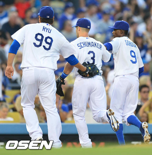 12일(이하 한국시간) 미국 캘리포니아 로스앤젤레스 다저스타디움에서 열리는 LA 다저스와 마이애미 말린스의 경기, 5회초 2사 주자 1,2루 2루수 마이애미 디아즈의타구를 LA 2루수 슈마커의 호수비를 본 후 엉덩이를 쳐주고 있다.