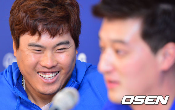 승리 투수가 된 다저스 류현진이 통역 마틴 김의 깜짝 발표에 즐거운 미소를 짓고 있다. 류현진은 기자회견에서 오늘이 어머니 박승순(54) 씨의 생일임을 전하며 호투를 펼쳐 더욱 기뻤다고 말했다./ dreamer@osen.co.kr