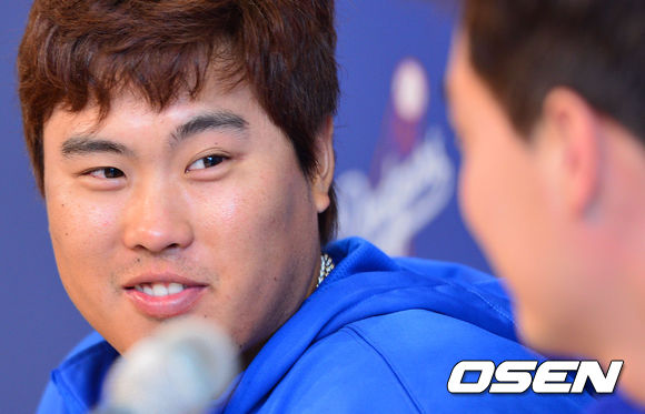 승리 투수가 된 다저스 류현진이 통역 마팀 김이 깜짝 발표에 즐거운 미소를 짓고 있다. 류현진은 기자회견에서 오늘이 어머니 박승순(54) 씨의 생일임을 전하며 호투를 펼쳐 더욱 기뻤다고 말했다./ dreamer@osen.co.kr
