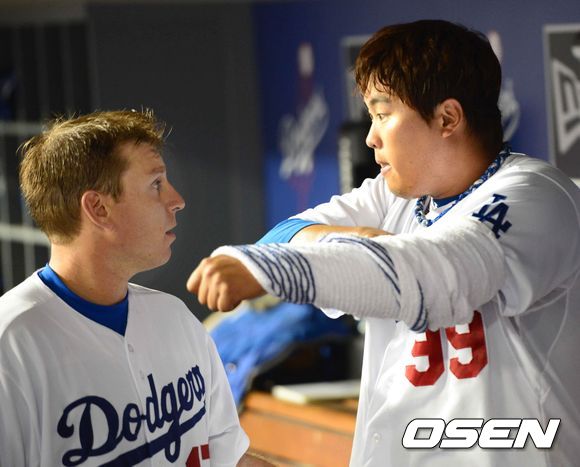 6회초 수비를 마친 류현진이 엘리스 포수와 이야기를 나누고 있다./ dreamer@osen.co.kr