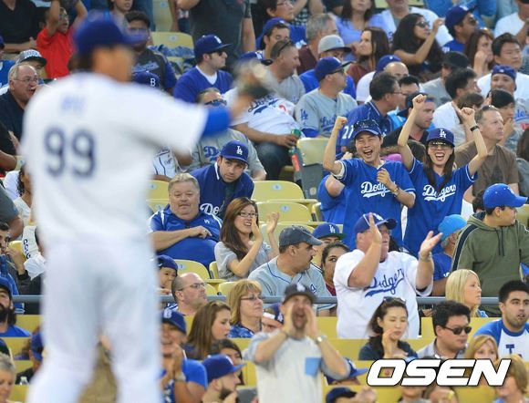 류현진의 방어율도 3.40으로 다소 낮아졌다. 5회 슈마커의 호수비로 이닝을 마친 류현진에게 팬들이 환호를 보내고 있다./ dreamer@osen.co.kr