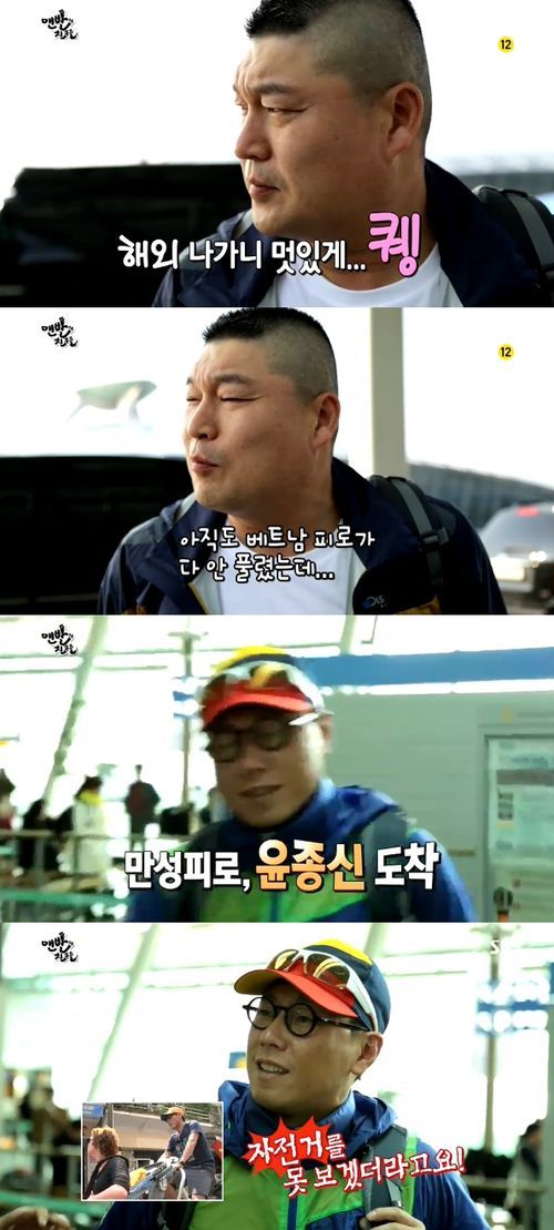 이어 도착한 윤종신도 마찬가지. 윤종신은 "피로가 일주일을 가더라"라며 "자전거를 잘 못보겠다"고 말해 멤버들을 폭소케 했다. '맨친' 멤버들은 앞서 베트남에서 씨클로 기사로 나서 하루 종일 자전거를 탔기 때문.