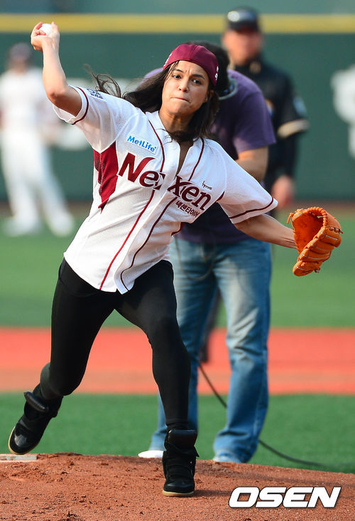 12일 오후 서울 목동구장에서 2013 한국야쿠르트 세븐프로야구 넥센 히어로즈와 SK 와이번스의 경기가 열릴 예정인 가운데 경기 전 할리우드 여배우 미셀 로드리게즈(Michelle Rodriguez)가 시구를 하고 있다.