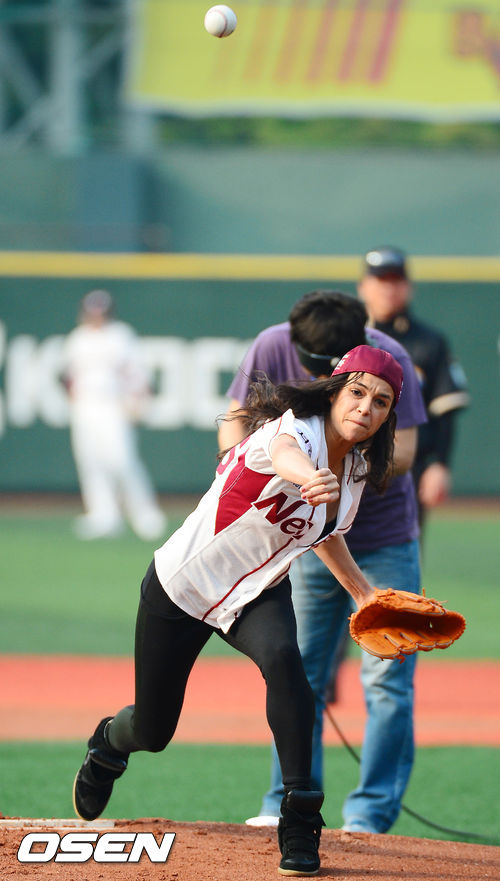 12일 오후 서울 목동구장에서 2013 한국야쿠르트 세븐프로야구 넥센 히어로즈와 SK 와이번스의 경기가 열릴 예정인 가운데 경기 전 할리우드 여배우 미셀 로드리게즈(Michelle Rodriguez)가 시구를 하고 있다.