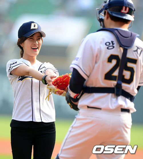 12일 오후 서울 잠실구장에서 열린 2013 한국야쿠르트 세븐프로야구 두산 베어스와 NC 다이노스의 경기, 경기에 앞서 개그우먼 김지민이 시구를 마치고 양의지와 이야기를 나누고 있다.