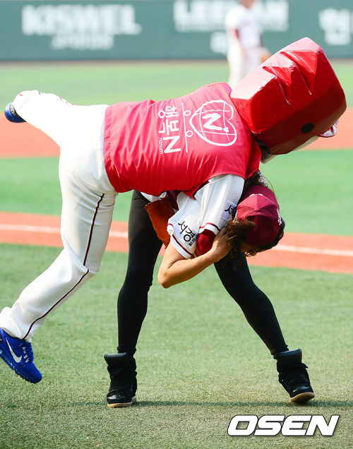 12일 오후 서울 목동구장에서 2013 한국야쿠르트 세븐프로야구 넥센 히어로즈와 SK 와이번스의 경기가 열릴 예정인 가운데 경기 전 할리우드 여배우 미셀 로드리게즈(Michelle Rodriguez)가 시구를 한 후 턱돌이를 땅에 내리 꽂고 있다.
