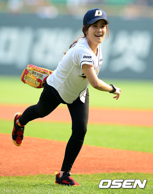 12일 오후 서울 잠실구장에서 열린 2013 한국야쿠르트 세븐프로야구 두산 베어스와 NC 다이노스의 경기, 경기에 앞서 개그우먼 김지민이 시구를 하고 있다.