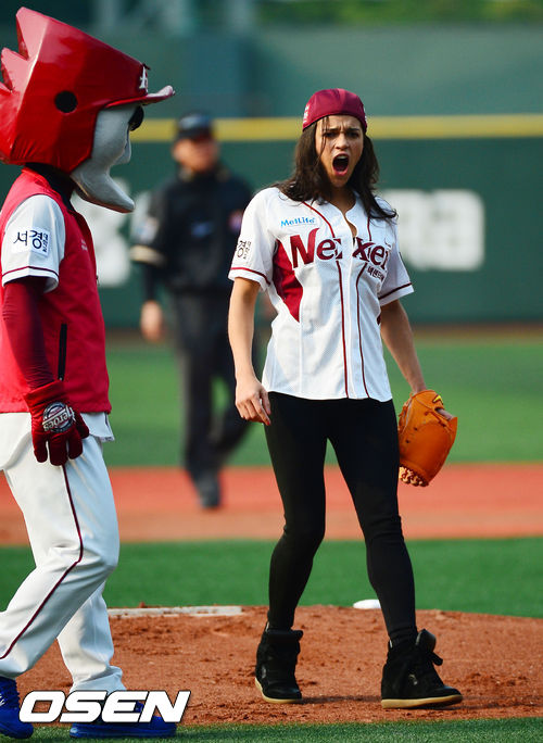 12일 오후 서울 목동구장에서 2013 한국야쿠르트 세븐프로야구 넥센 히어로즈와 SK 와이번스의 경기가 열릴 예정인 가운데 경기 전 할리우드 여배우 미셀 로드리게즈(Michelle Rodriguez)가 시구 전 마운드 위에 서라는 말에 놀라고 있다.
