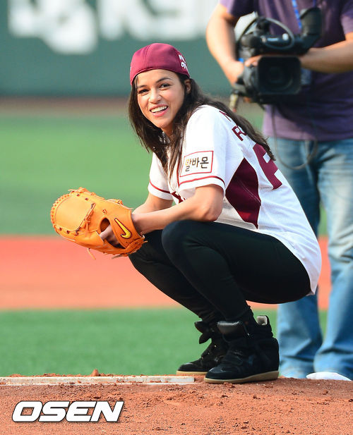 12일 오후 서울 목동구장에서 2013 한국야쿠르트 세븐프로야구 넥센 히어로즈와 SK 와이번스의 경기가 열릴 예정인 가운데 경기 전 할리우드 여배우 미셀 로드리게즈(Michelle Rodriguez)가 시구 전 마운드 위에서 앉고 있다.