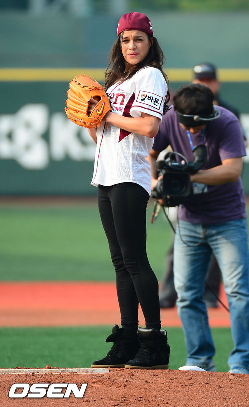 12일 오후 서울 목동구장에서 2013 한국야쿠르트 세븐프로야구 넥센 히어로즈와 SK 와이번스의 경기가 열릴 예정인 가운데 경기 전 할리우드 여배우 미셀 로드리게즈(Michelle Rodriguez)가 시구를 하고 있다.