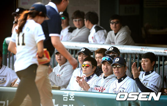 12일 오후 서울 잠실구장에서 열린 2013 한국야쿠르트 세븐프로야구 두산 베어스와 NC 다이노스의 경기, 경기에 앞서 개그우먼 김지민이 시구를 마치고 두산 더그아웃의 선수들에게 인사를 하고 있다.