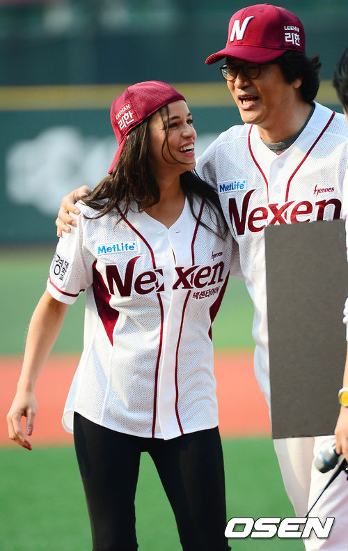 12일 오후 서울 목동구장에서 2013 한국야쿠르트 세븐프로야구 넥센 히어로즈와 SK 와이번스의 경기가 열릴 예정인 가운데 경기 전 할리우드 여배우 미셀 로드리게즈(Michelle Rodriguez)가 시구를 한 후 시타를 맡은 지휘자 서희태씨와 즐겁게 어깨동무를 하고 있다.