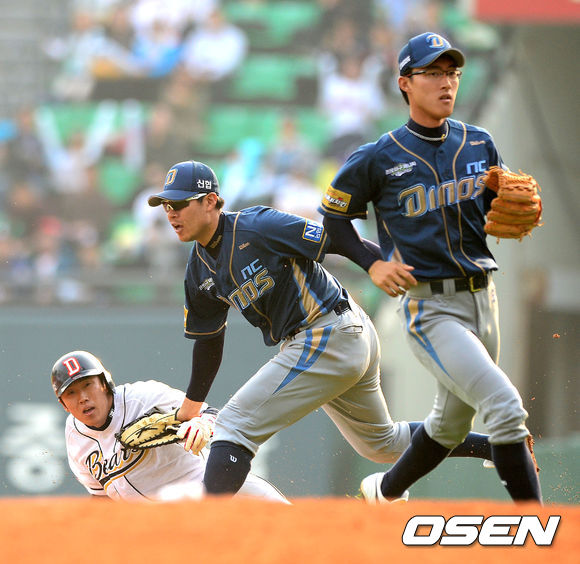 12일 오후 서울 잠실구장에서 열린 2013 한국야쿠르트 세븐프로야구 두산 베어스와 NC 다이노스의 경기, 2회말 2사 1,3루에서 2루 도루를 시도한 두산 허경민이 NC 조영훈에 태그아웃당하고 있다.