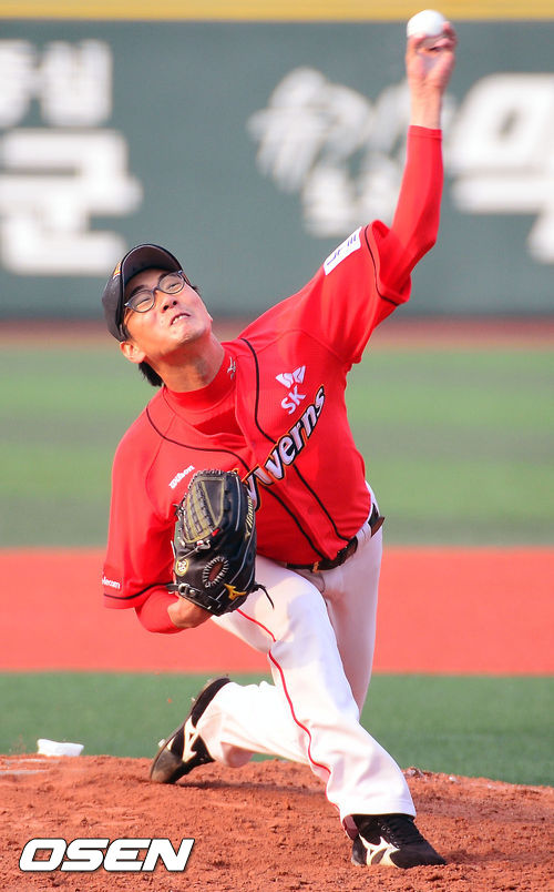12일 오후 서울 목동구장에서 2013 한국야쿠르트 세븐프로야구 넥센 히어로즈와 SK 와이번스의 경기, SK 선발 김광현이 힘차게 공을 뿌리고 있다.