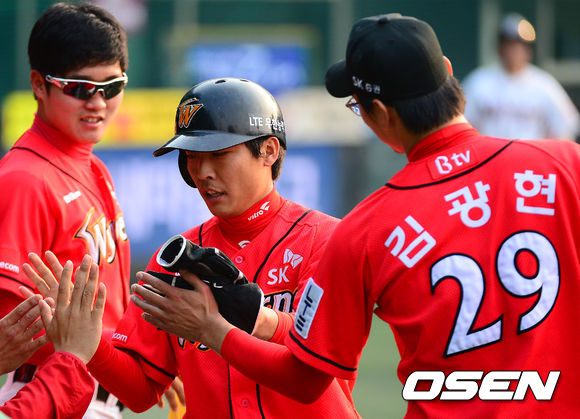 12일 오후 서울 목동구장에서 2013 한국야쿠르트 세븐프로야구 넥센 히어로즈와 SK 와이번스의 경기, 3회초 2사 주자 1루 SK 최정의 1타점 적시타때 1루 주자 조동화가 홈에서 세이프 된 후 조동화가 덕아웃에서 김광현과 하이파이브를 하고 있다.