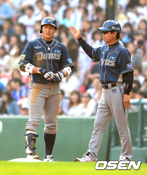 12일 오후 서울 잠실구장에서 열린 2013 한국야쿠르트 세븐프로야구 두산 베어스와 NC 다이노스의 경기, 3회초 1사 1,3루에서 NC 나성범이 1타점 우전 적시타를 날리고 전준호 코치와 기뻐하고 있다.
