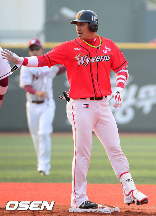 12일 오후 서울 목동구장에서 2013 한국야쿠르트 세븐프로야구 넥센 히어로즈와 SK 와이번스의 경기, 2회초 2사 주자 2루 SK 김강민이 선취 1타점 적시타를 날린 후 2루에서 사인을 보내고 있다.