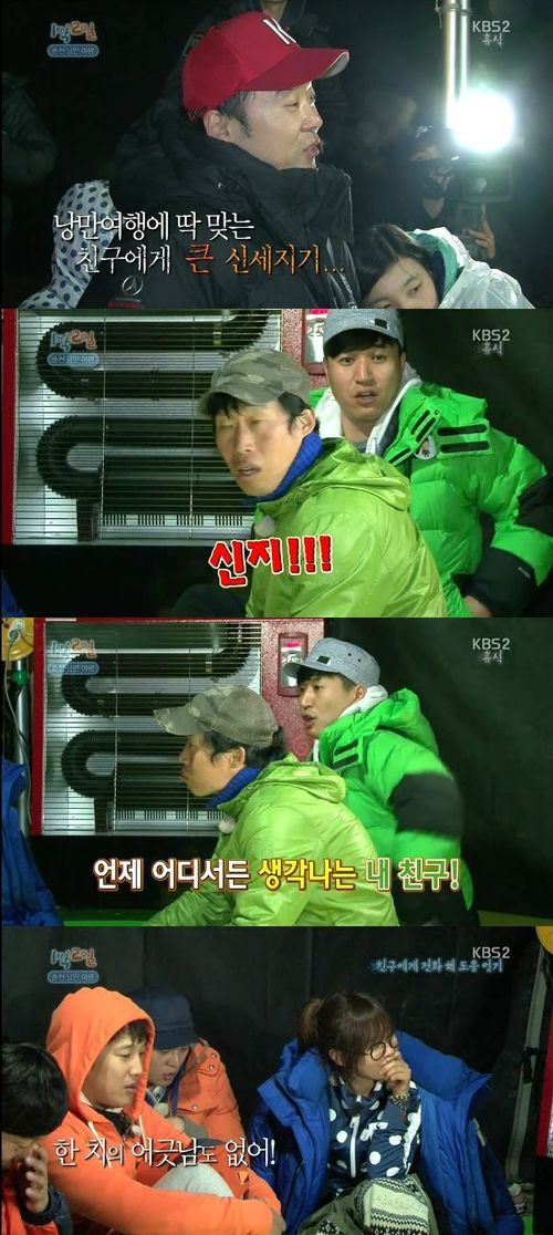 전화가 걸리자 신지는 "리더님"이라며 다정하게 전화를 받았다. 그러나 반가움도 잠시 김종민이 "뭐하냐"고 묻자 신지는 불길한 예감을 느낀 듯 "'1박2일' 촬영중이지? 끊어"라며 전화를 끊어 버렸다.