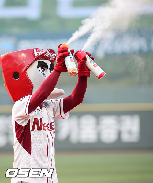 12일 오후 서울 목동구장에서 2013 한국야쿠르트 세븐프로야구 넥센 히어로즈와 SK 와이번스의 경기에서 턱돌이가 살충제를 뿌리고 있다.