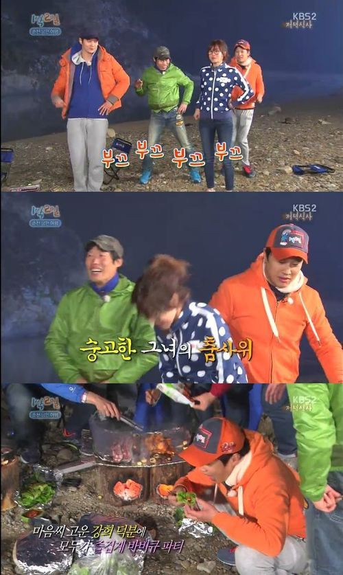 최강희는 12일 오후 방송된 KBS 2TV 예능 프로그램 '해피선데이-1박2일 시즌2'(이하 '1박2일')에서 삼겹살을 먹지 못하고 있는 유해진과 차태현을 위해 춤을 추는 노력을 벌였다.