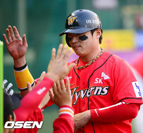 12일 오후 서울 목동구장에서 2013 한국야쿠르트 세븐프로야구 넥센 히어로즈와 SK 와이번스의 경기에서 6회초 무사 주자 1,3루 SK 김강민의 좌익수 오른쪽 1타점 적시타때 홈을 밟은 박재상이 덕아웃에서 동료들과 기쁨을 나누고 있다.