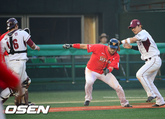 12일 오후 서울 목동구장에서 2013 한국야쿠르트 세븐프로야구 넥센 히어로즈와 SK 와이번스의 경기에서 6회초 1사 주자 2,3루 SK 박진만의 3루수 앞 땅볼때 3루 주자 조성우가 태그아웃 당하고 있다.