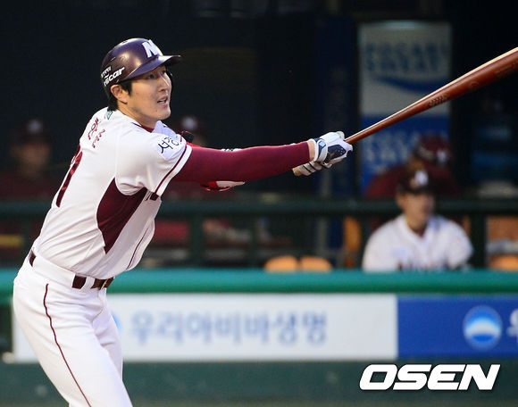 12일 오후 서울 목동구장에서 2013 한국야쿠르트 세븐프로야구 넥센 히어로즈와 SK 와이번스의 경기에서 6회말 1사 주자 2루 넥센 유한준이 우중간 1타점 적시타를 날리고 있다.