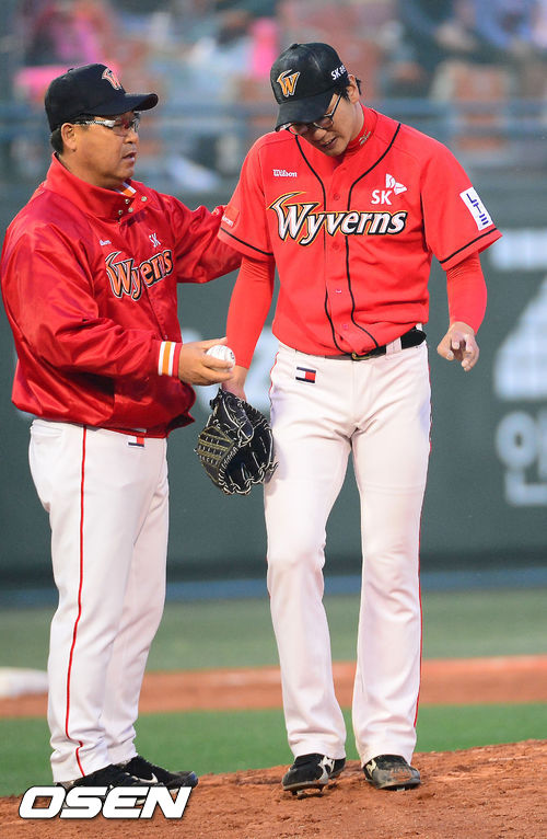 12일 오후 서울 목동구장에서 2013 한국야쿠르트 세븐프로야구 넥센 히어로즈와 SK 와이번스의 경기에서 6회말 1사 주자 2루 넥센 유한준에게 우중간 1타점 적시타를 맞은 SK 선발 김광현이 교체되고 있다.