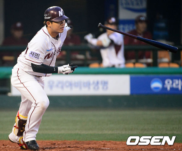 12일 오후 서울 목동구장에서 2013 한국야쿠르트 세븐프로야구 넥센 히어로즈와 SK 와이번스의 경기에서 6회말 1사 주자 3루 넥센 김민성이 우익수 앞 동점 1타점 적시타를 날리고 있다.