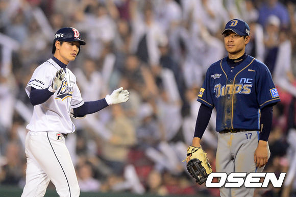 12일 오후 서울 잠실구장에서 열린 2013 한국야쿠르트 세븐프로야구 두산 베어스와 NC 다이노스의 경기, 8회말 무사 만루에서 두산 민병헌이 2타점 적시타를 날리고 기뻐하고 있다.