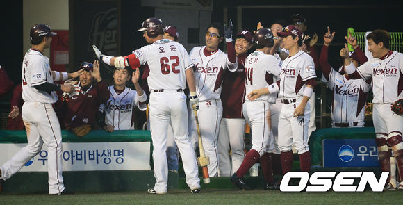 12일 오후 서울 목동구장에서 2013 한국야쿠르트 세븐프로야구 넥센 히어로즈와 SK 와이번스의 경기에서 6회말 1사 주자 만루 넥센 장기영의 역전 적시타때 김민성이 홈을 밟은 후 서건창이 실책으로 홈에서 세이프됐다. 김민성과 서건창이 홈에서 하이파이브를 하고 있다.